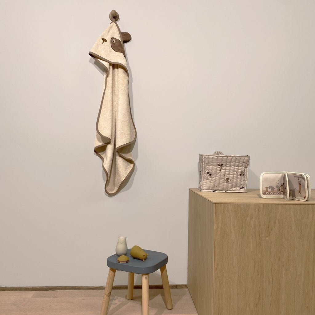De capuchon is afgewerkt met een fijn geborduurd zwaangezichtje en kleine oortjes, waardoor afdrogen een extra knuffelmoment wordt.