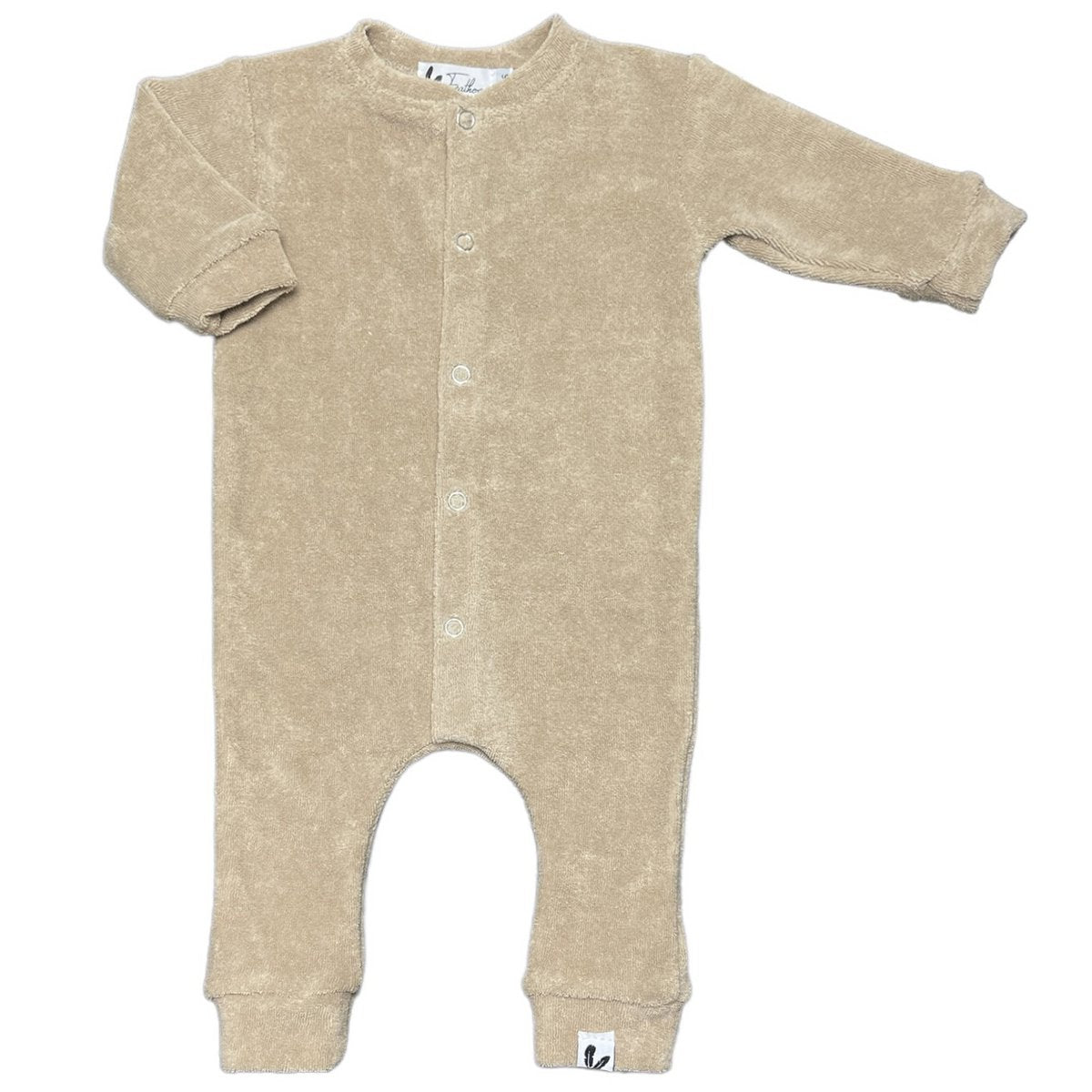 Elk pakje wordt met zorg handgemaakt in Nederland, waardoor je verzekerd bent van een kwalitatief en duurzaam kledingstuk. De rustige zandkleur geeft het pakje een tijdloze en unisex uitstraling, perfect passend in elke babygarderobe.