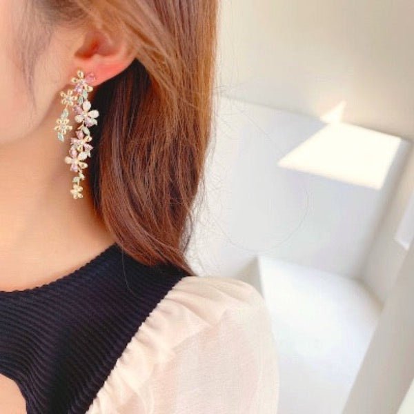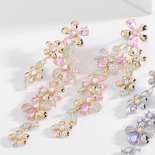 Een bloemrijke blikvanger vol elegantie. Deze lange oorbellen stralen met roze en lichtgroene zirkonia in een verfijnd bloemdessin. Het opvallende longline-silhouet (7,5 x 2,2 cm) vangt de schoonheid van bloesem in volle bloei. Perfect voor speciale gelegenheden of een stijlvol statement.
