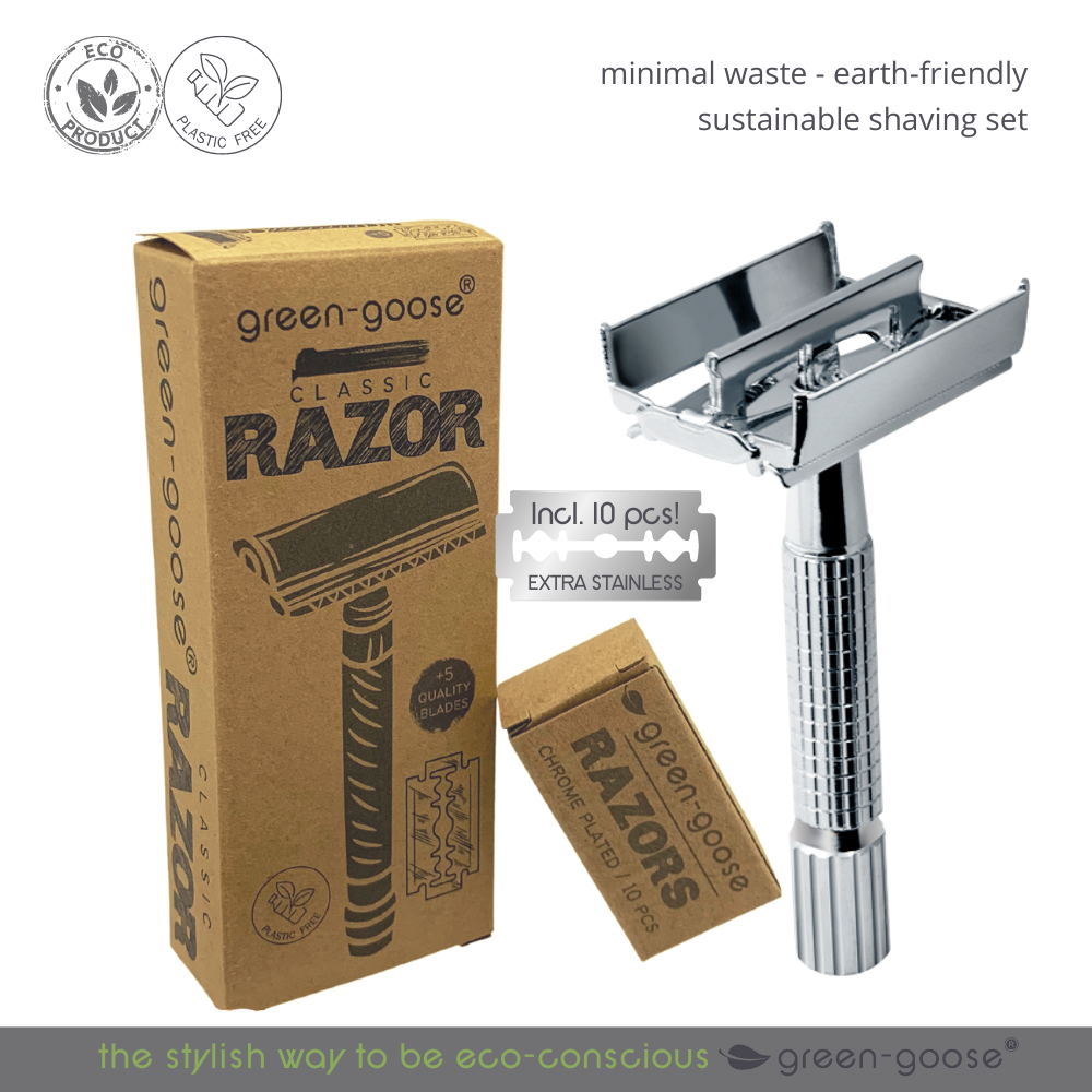 Geen plastic meer in de badkamer. Met de klassieke scheerset van Green-Goose scheer je bewust, comfortabel en duurzaam — met respect voor je huid, je portemonnee én de planeet.