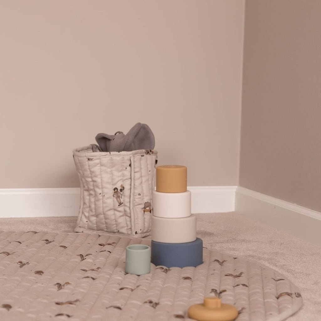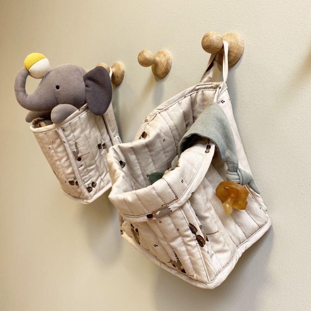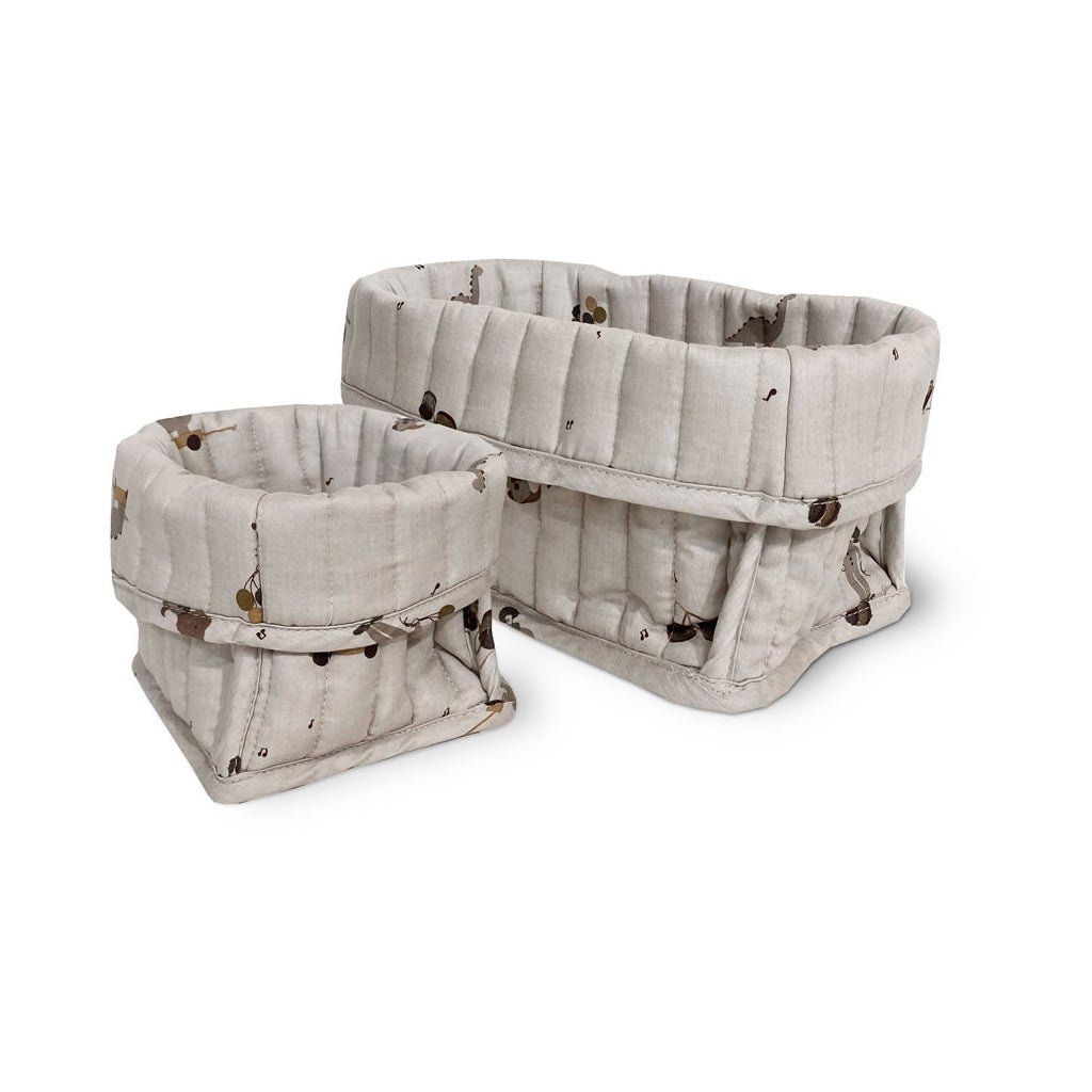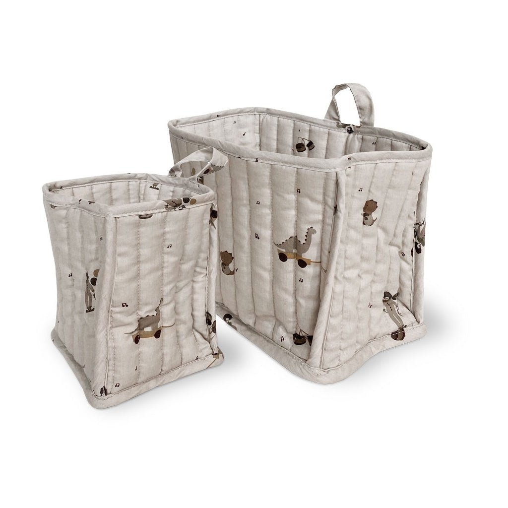 Orde en stijl in de kinderkamer! Deze gewatteerde mandenset is perfect om alle babybenodigdheden overzichtelijk te bewaren. Gemaakt van 100% biologisch katoen en voorzien van een vrolijk Music Dino design. Ideaal voor op de commode, in de badkamer of op een plankje in de kinderkamer.