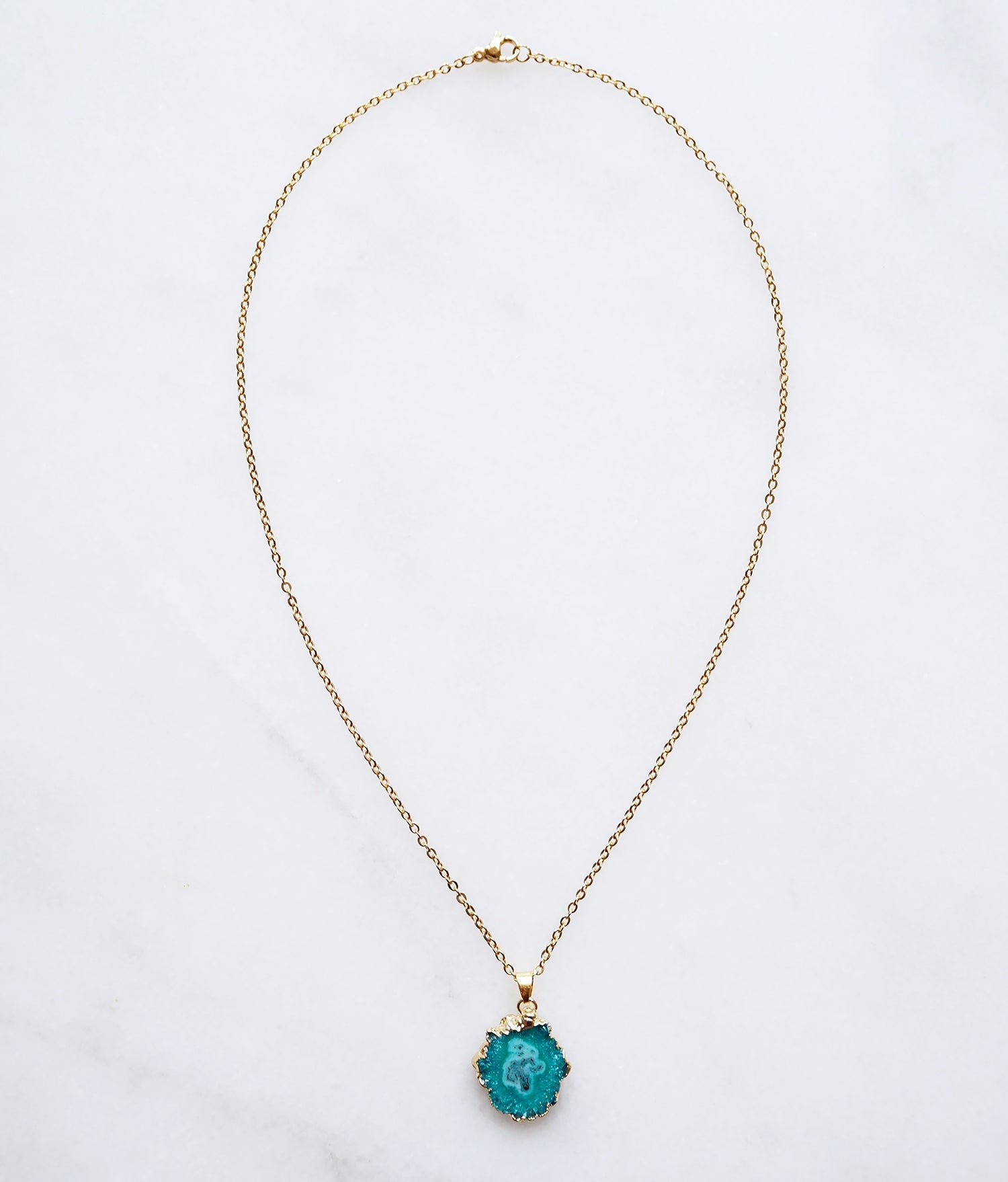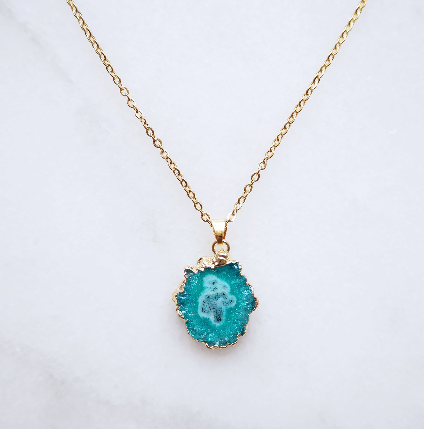 De Turquoise Druzy Agaat ketting is een verfijnd statement sieraad met een frisse turquoise kleur en een sprankelend druzy-oppervlak. De natuurlijke kristalstructuur vangt het licht op subtiele wijze en geeft de ketting een levendige maar rustige uitstraling. Turquoise agaat wordt traditioneel geassocieerd met bescherming, kracht en zelfexpressie.